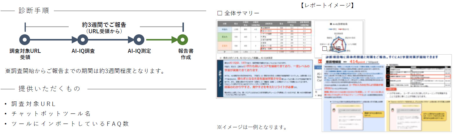 導入済みのチャットボットに対し、「対話力」「反応力」「正答力」の3つの観点からAIの賢さを診断します。この診断では自社と競合他社とのAIチャットボットのコミュニケーション力を、トランスコスモスのナレッジ運用知見をもとに作成した20問のAI抜き打ちテストにより数値化し、日本語の意図理解や、シナリオの精度、類似する事項を選択する際の正確率、回答カバー率などを詳細に分析、自社の弱点を特定します。
