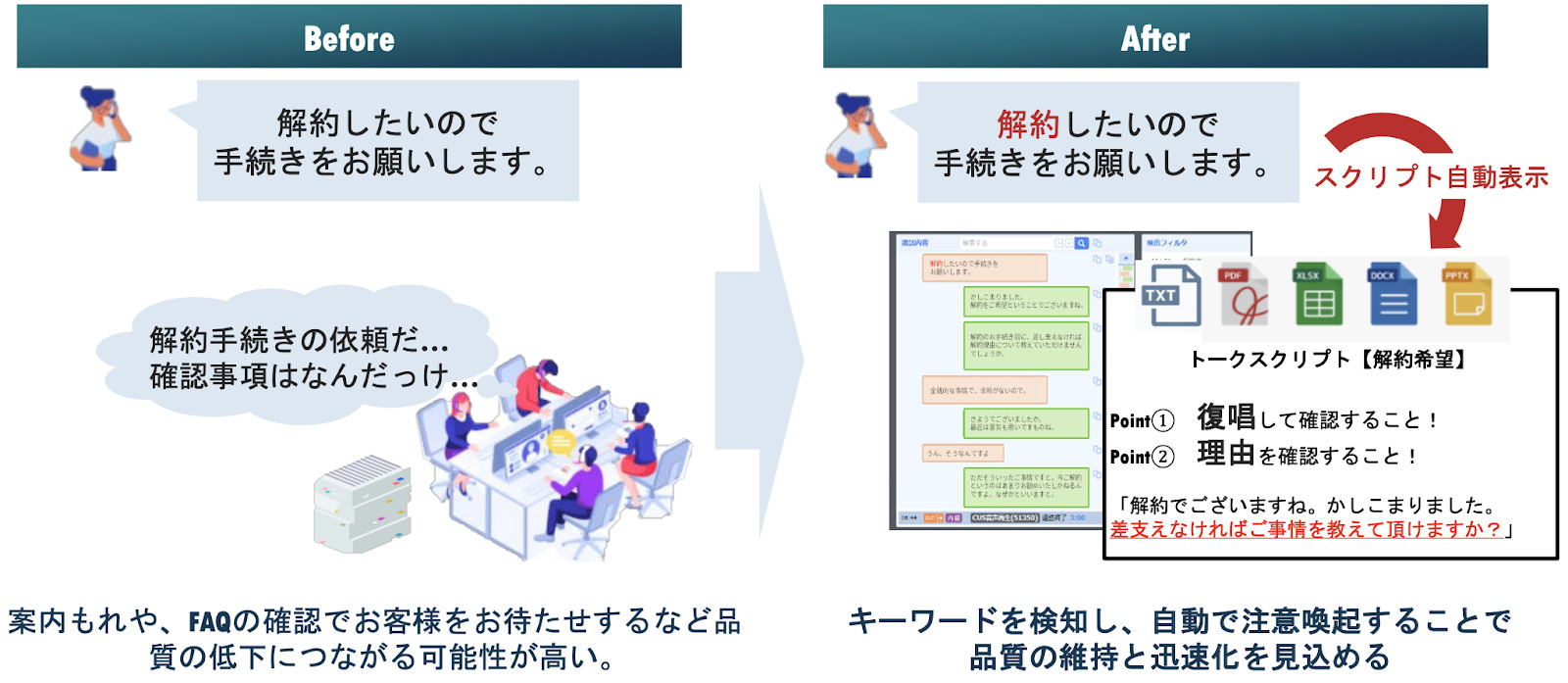 応対時間が長くなる原因として考えられるのが、ナレッジ(マニュアルやFAQ)・トークスクリプト(会話の台本)の精度が低く、円滑な応対ができていないケースです。