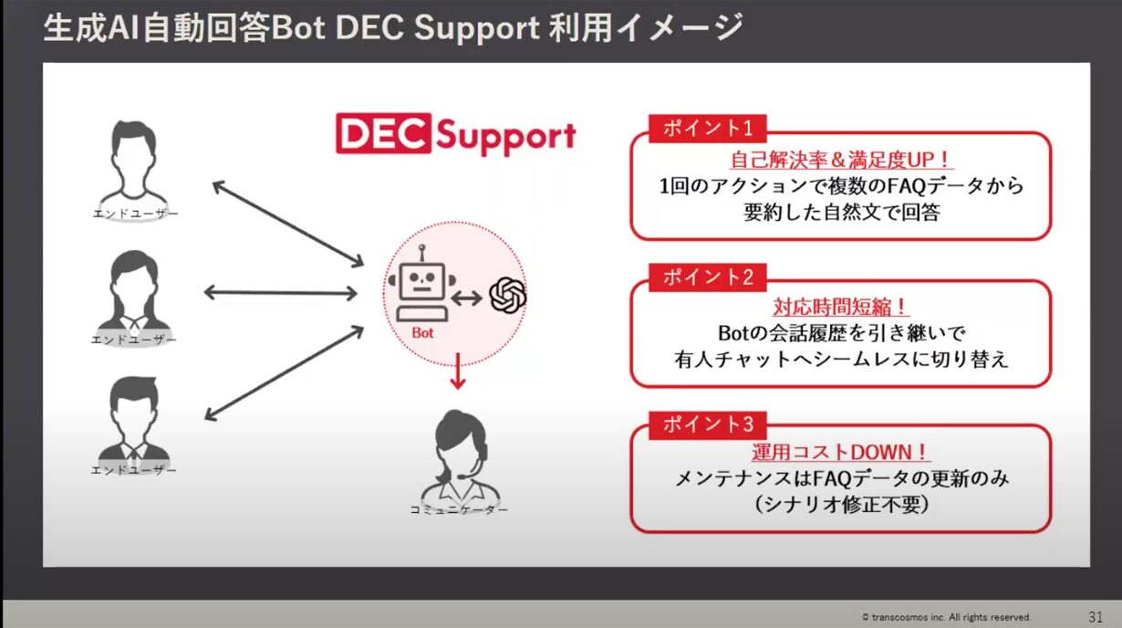 それを踏まえて、最後に最新の取り組みとして、生成AIを活用したユーザー対応のAI「DEC Support」についてご紹介しておきましょう。