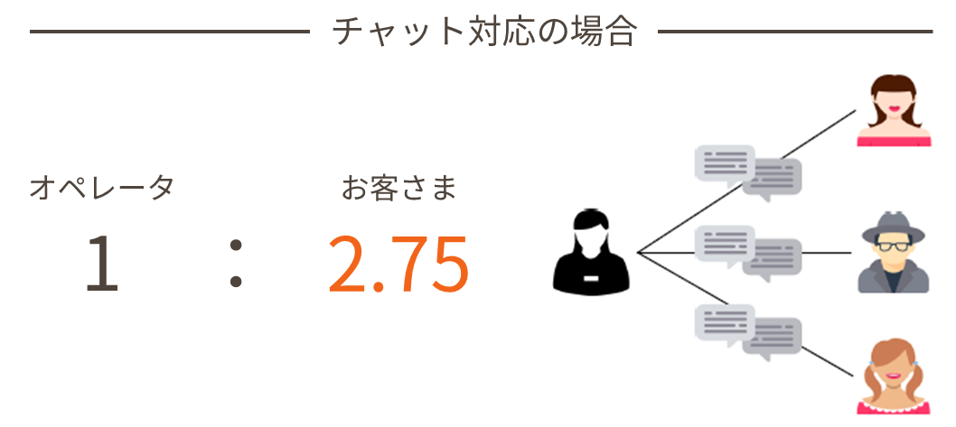 電話の場合はどうしても1対1での対応になりますが、チャットやメールは同時に複数人の対応が可能です。着信のバラつきや稼働率を加味した同時対応は約1.7前後が標準ですが、繫忙時間帯は下記のように2.7人や3人など、同時対応人数を増やすことも検討できます。