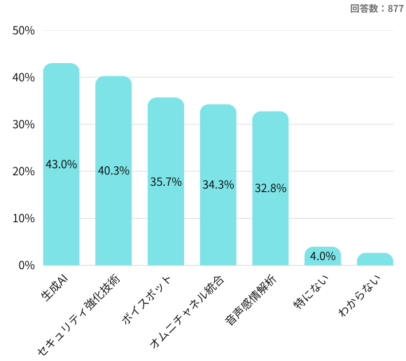 一方で、セキュリティ強化技術が2位に位置づけられたことも重要な示唆です。AI活用や在宅勤務の定着に伴い、センター内外で扱う情報量が増えたことで、情報漏洩リスクやアクセス管理の高度化が避けられないテーマとなっています。