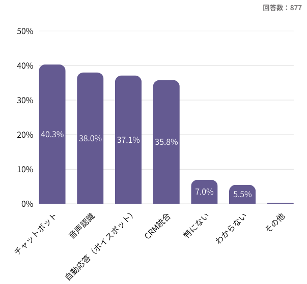 今後導入を予定しているソリューションとして「チャットボット(40.3%)」が最も多いことが明らかになりました。すでに導入率でもトップであるチャットボットは、問い合わせの一次受けや自己解決支援において高い効果が期待されており、今後も引き続き導入・強化の中心となる領域であることがうかがえます。