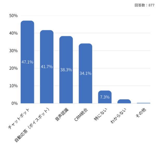 また、CRM統合は34.1%と3割を超えており、顧客情報を一元管理しようとする動きが一定程度広がっていることがわかります。これは、チャットや音声など複数チャネルに分散しがちな顧客データを統合し、応対品質の均質化や分析基盤の整備につなげたいというニーズの表れでしょう。複数ソリューションの併用が主流であることから、導入の目的は単一課題の解決ではなく、運用全体の効率化・高度化へと広がっている傾向が見受けられます。