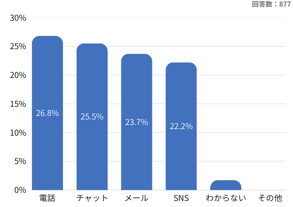 AIチャットボットや有人チャットの併用が進み、24時間対応や気軽な問い合わせが可能になったことで選ばれやすくなっています。このように、電話・チャット・メール・SNSの4チャネルがすべて20%台で拮抗している状況は、顧客が目的や状況に応じて“最適な手段を選び分ける”段階に進んでいることを表しています。