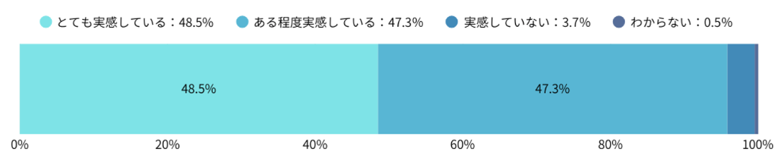 その内訳を見ると、「とても実感している」48.5%、「ある程度実感している」47.3%と、ほぼすべての利用者がポジティブな評価を示しており、「実感していない」層は3.7%にとどまっています。