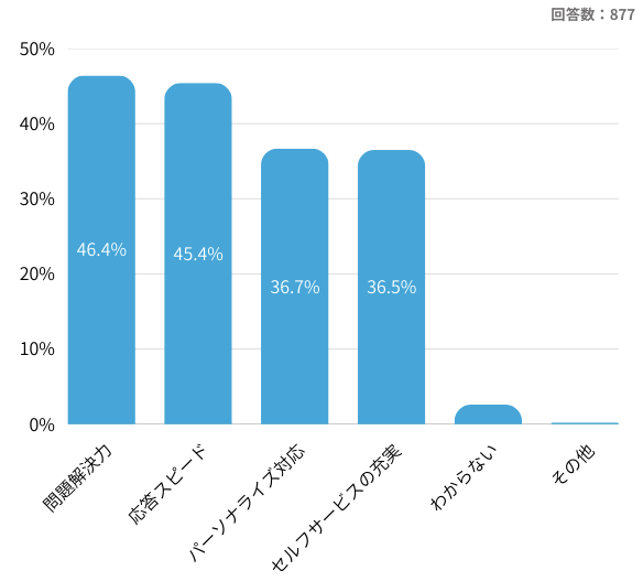 さらに、パーソナライズ対応(36.7%)や セルフサービスの充実(36.5%) も3割を超える支持を得ており、センターへの期待が「ただ解決するだけ」から、「自分に合った対応をしてほしい」「自分で素早く解決できる環境がほしい」という方向へ広がっていることが読み取れます。