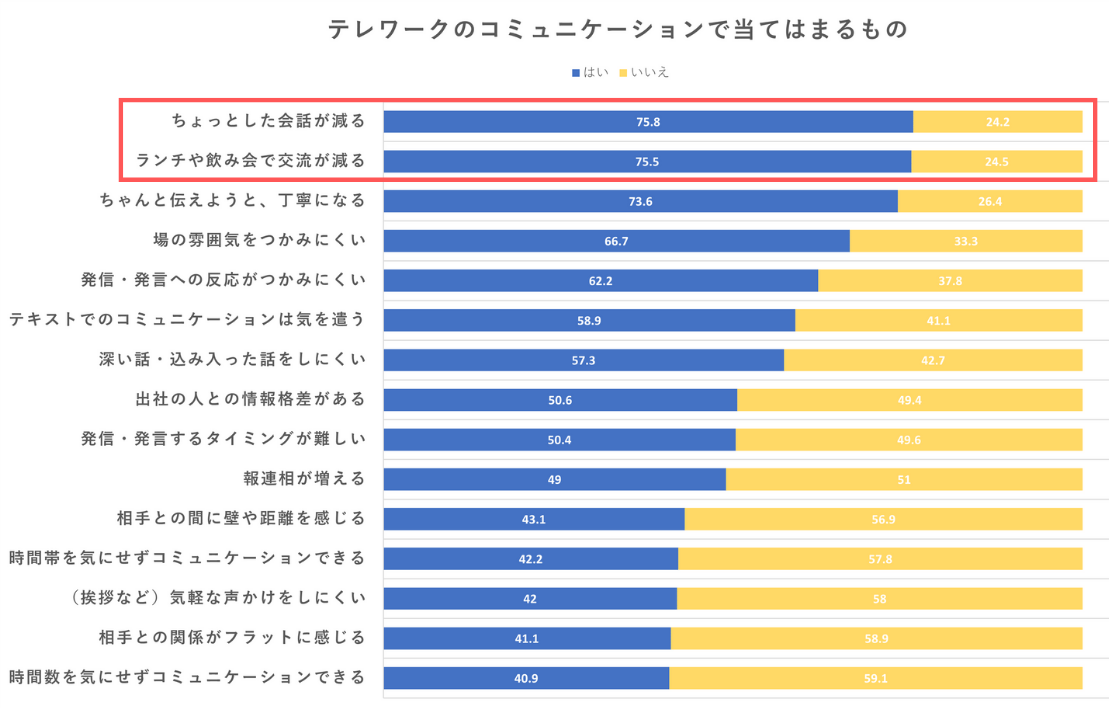 もちろん、会社に出社して仕事をしているときのコミュニケーションは働き方や企業によって異なる為、一概に出社時とのコミュニケーション量を比較することはできません。また、社内でのコミュニケーションの時間が減少したからといって必ず業務に支障が出るとも限りません。