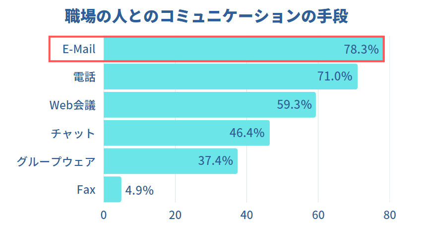 サイボウズチームワーク総研の調査によると、テレワーク中での職場の人とのコミュニケーションについて、「E-mail」で行うと答えた人が78.3%でトップでした。