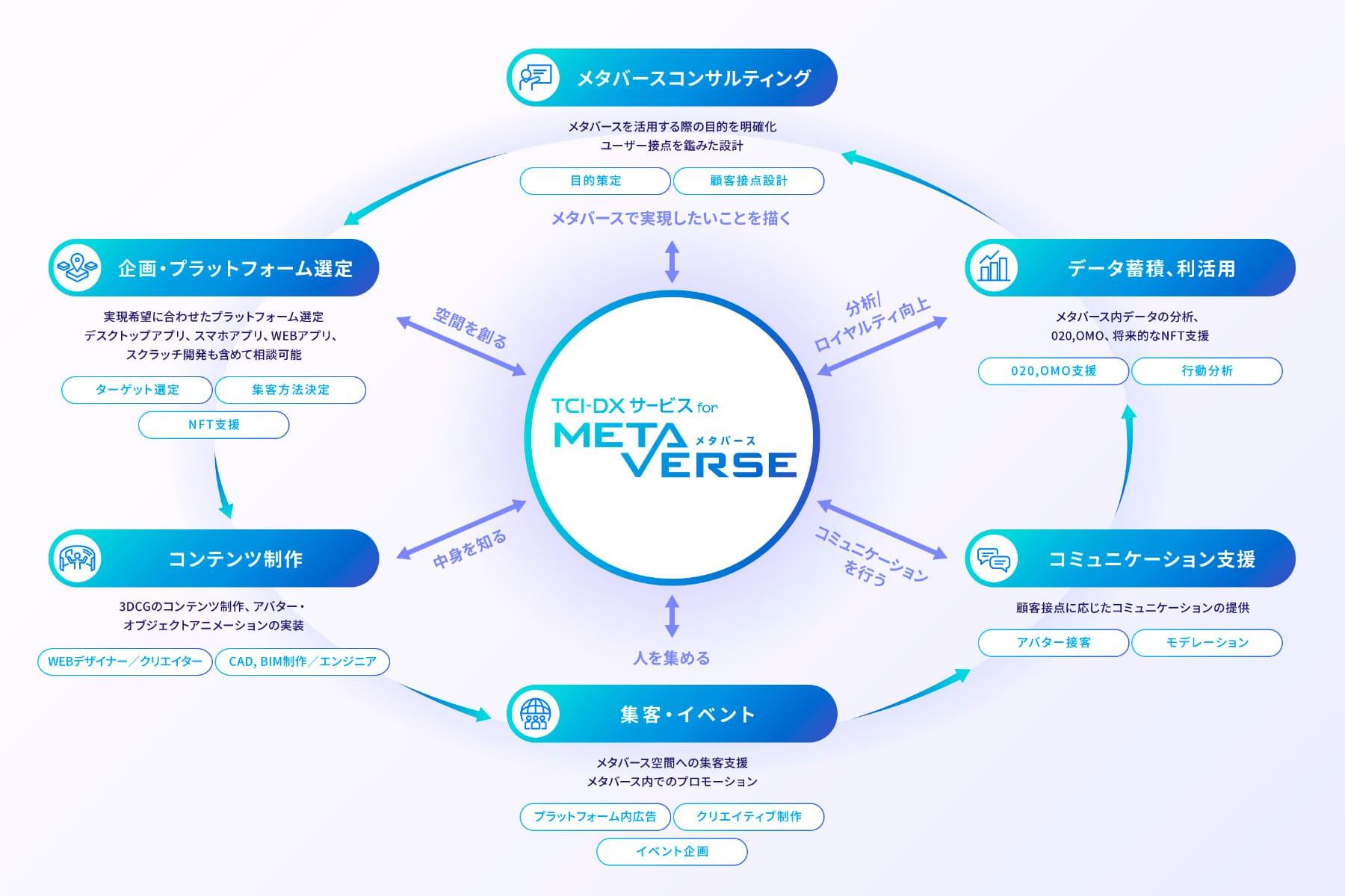 その中のサービスの一つとして、Web型メタバース提供をはじめ、各種メタバースソリューションの活用を企画・コンサルティングからプラットフォーム選定開発、集客、コミュニケーション支援、データ利活用までワンストップで提供しています。
