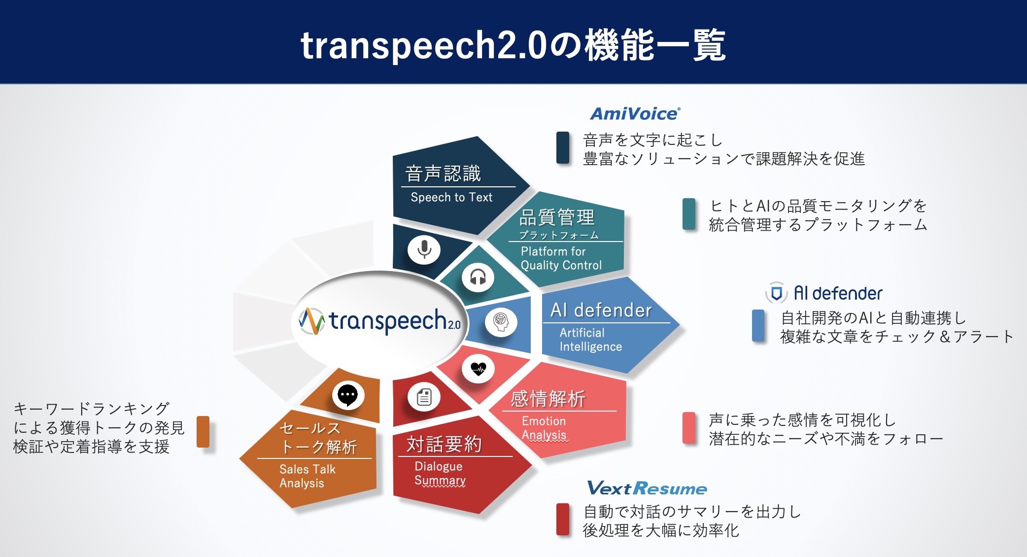「transpeech」は、音声認識専門部隊が導入から運用までをワンストップで提供し、コンタクトセンターの品質向上と業務効率化を促進しています。機能として主に以下が挙げられます。